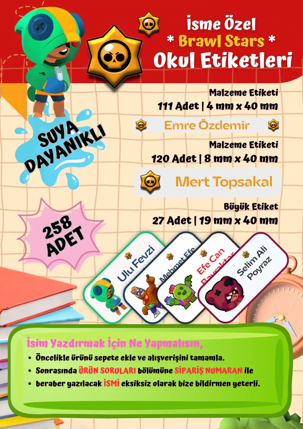 BRAWL STARS Okul Etiketi Defter Etiketi Kalem Etiketi Kişiye Özel Suya Dayanıklı İsim Yazılabilien