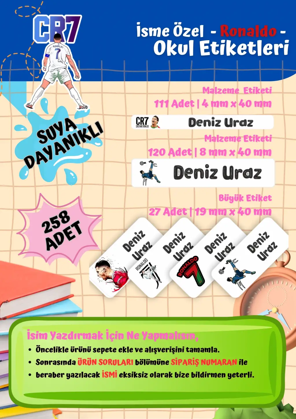 Çocuklarınızın kalem, defter, kitap, suluk ve diğer eşyalarının karışmaması için özel olarak hazırlanan Ronaldo temalı kişiye özel okul etiketi seti ile eşyalar hem şık hem de düzenli olacak.