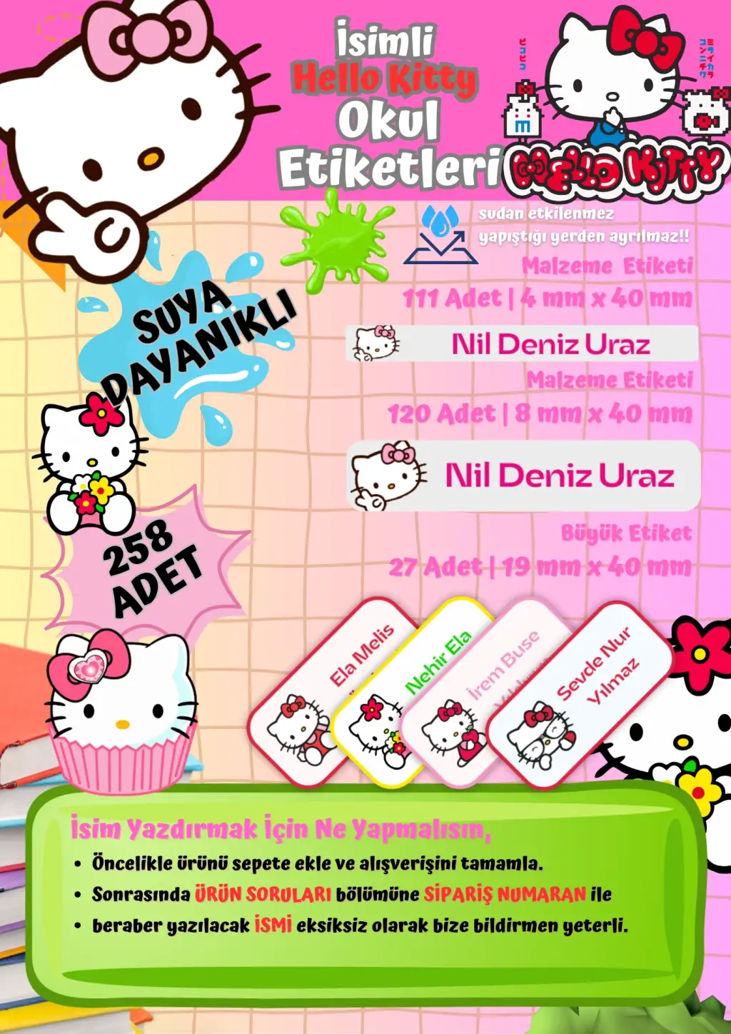 Hello Kitty Okul Etiketi Defter Etiketi Kalem Etiketi Kişiye Özel Suya Dayanıklı İsim Yazılabilien
