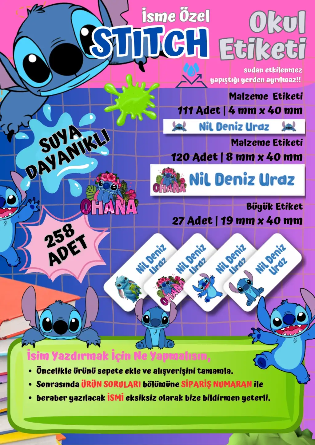 Çocuklarınızın kalem, defter, kitap, suluk ve diğer eşyalarının karışmaması için özel olarak hazırlanan Stitch temalı kişiye özel okul etiketi seti ile eşyalar hem şık hem de düzenli olacak.