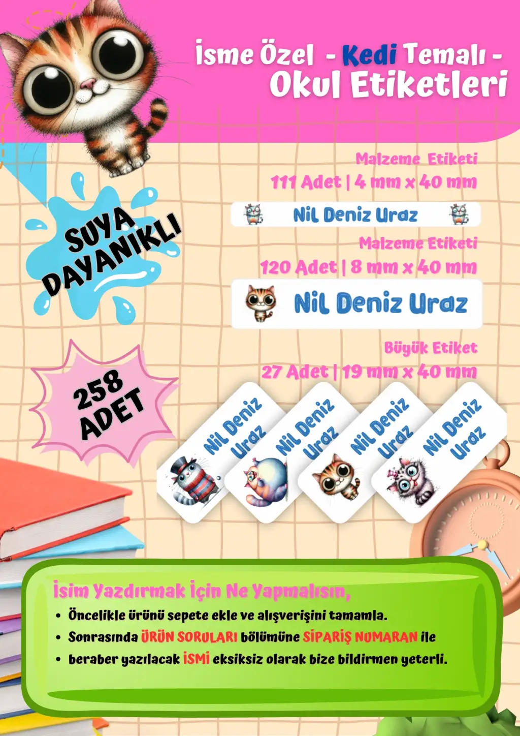Çocuklarınızın kalem, defter, kitap, suluk ve diğer eşyalarının karışmaması için özel olarak hazırlanan Kedi temalı kişiye özel okul etiketi seti ile eşyalar hem şık hem de düzenli olacak.