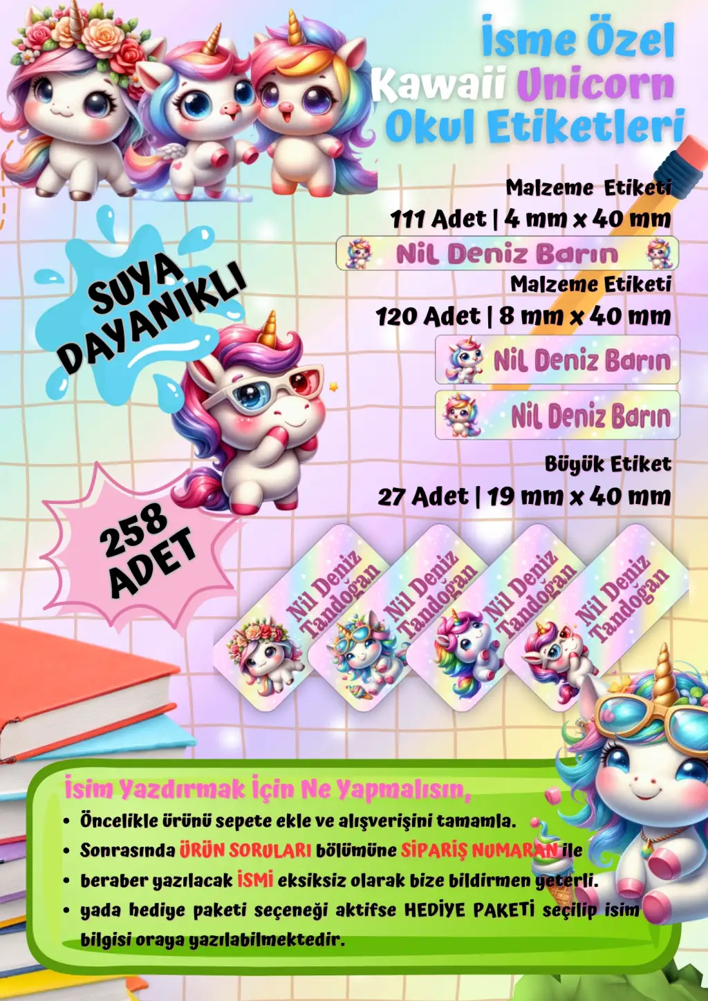 Sevimli Kawaii tarzı Unicorn Temalı Kişiye Özel Suya Dayanıklı Okul Etiketi Seti – 258 Adet İsimli Çıkartma