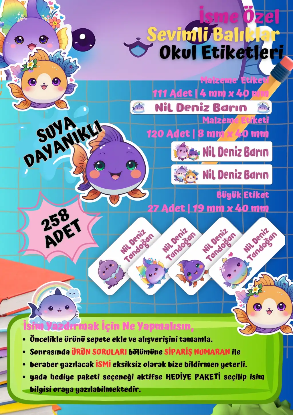 Sevimli Balıklar Temalı Kişiye Özel Suya Dayanıklı Okul Etiketi Seti – 258 Adet İsimli Çıkartma