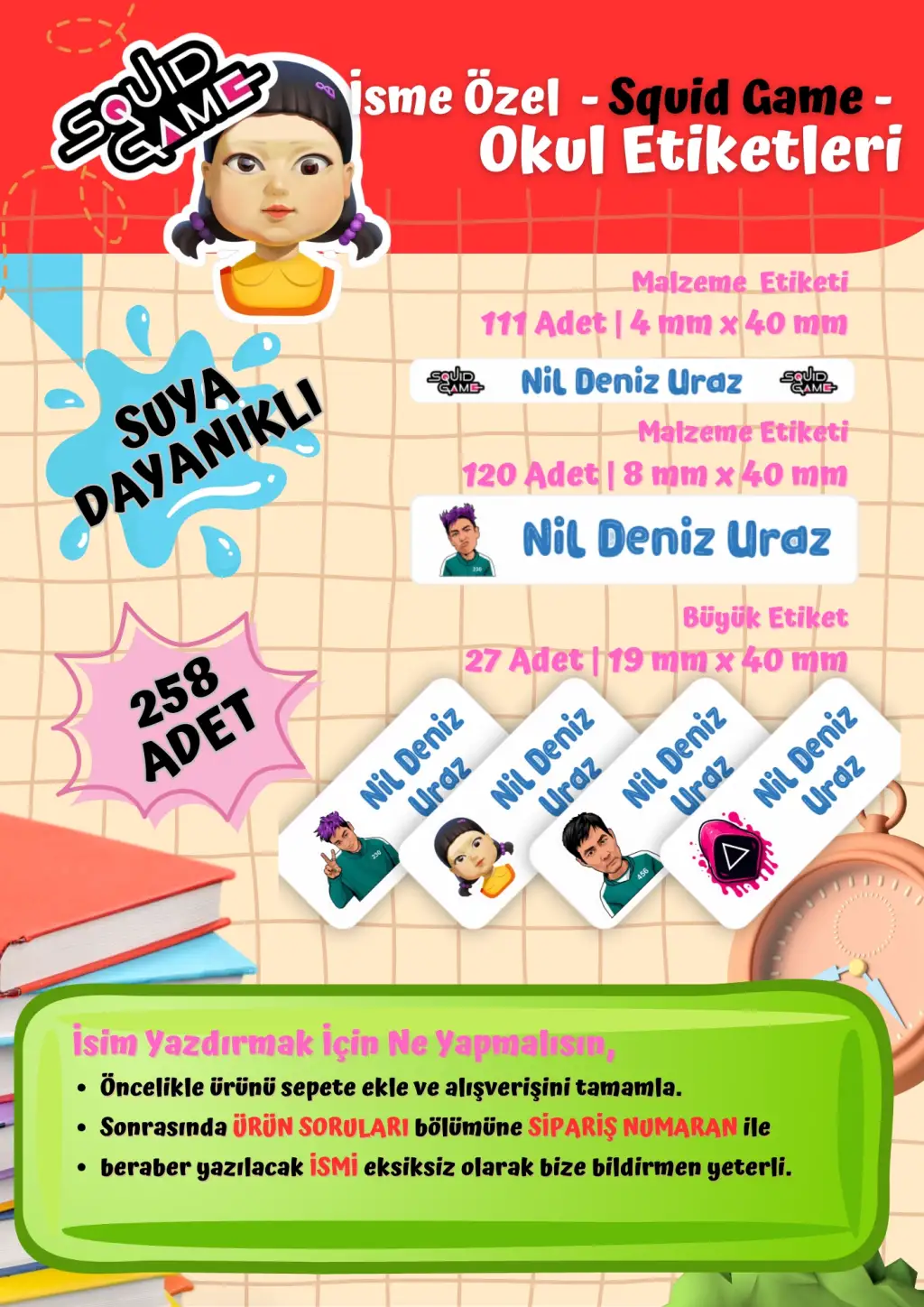 Çocuklarınızın kalem, defter, kitap, suluk ve diğer eşyalarının karışmaması için özel olarak hazırlanan Squid Game temalı kişiye özel okul etiketi seti ile eşyalar hem şık hem de düzenli olacak.