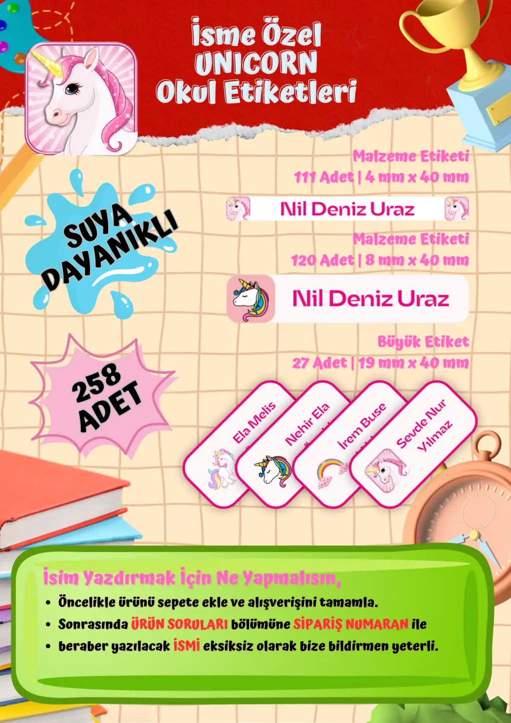 Unicorn Okul Etiketi Defter Etiketi Kalem Etiketi Kişiye Özel Suya Dayanıklı İsim Yazılabilien